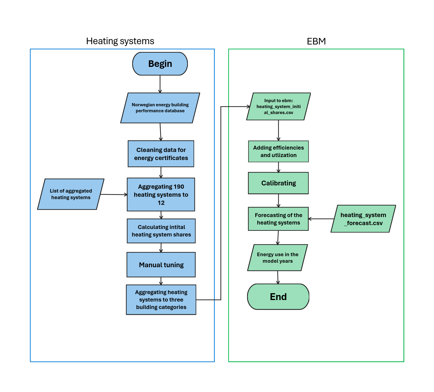 The input to EBM is the aggregated composition of heating systems houses, apartment blocks and non-residential buildings, in other words the share of e.g. the area in houses that use the different heating systems. The source of the initial composition is the Norwegian energy performance building database which has been processed outside of EBM and described under data assumptions NVE. As part of this processing, the use of different energy products in the different building categories is compared with the national energy balance to fine tune the distribution of the various heating technologies. The process is described under model functionality and data assumptions NVE and an overview is shown in the flowchart below.